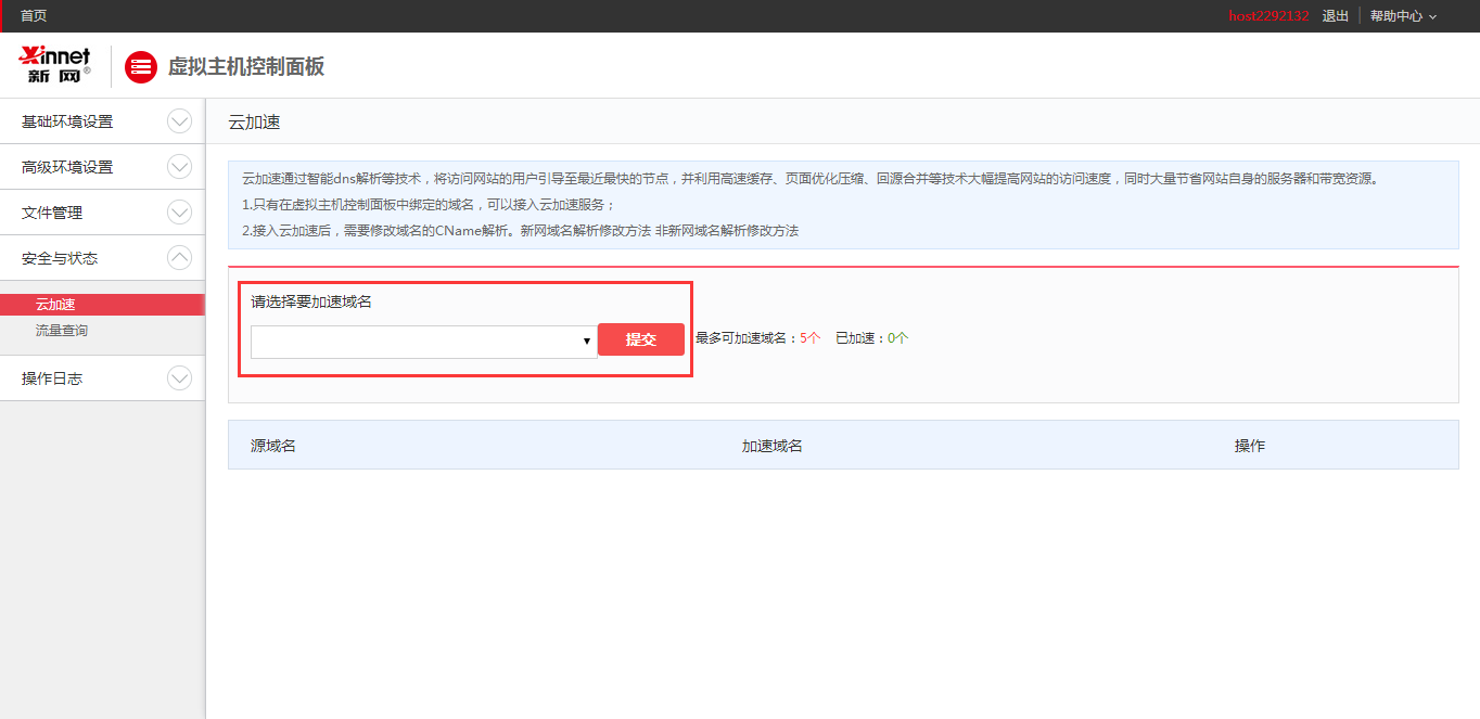 1. 登錄cp.xinnet.com,選擇“安全與狀態(tài)”,選擇“云加速”;